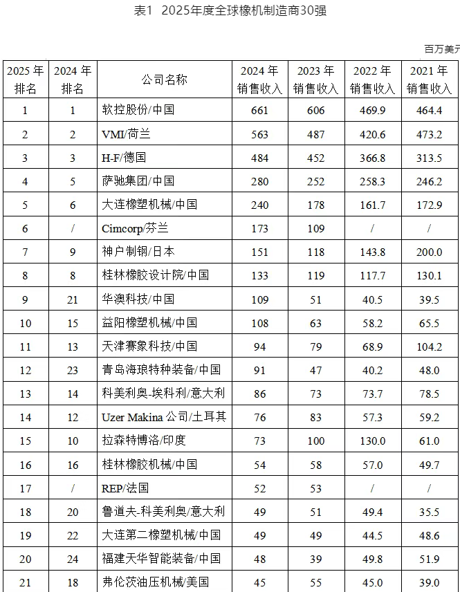 表1 2025年度全球橡機(jī)制造商30強(qiáng)