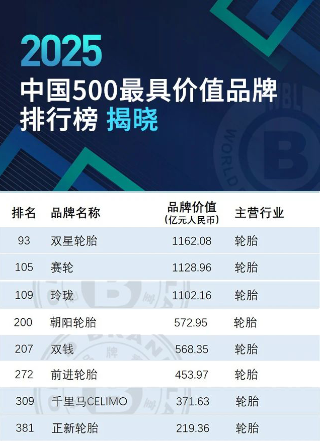 【炭黑產(chǎn)業(yè)網(wǎng)】6月19日消息,近日,第22屆世界品牌大會在北京圓滿落幕,期間,備受矚目的2025年《中國500最具價值品牌》分析報告由世界品牌實驗室正式揭曉。在輪胎行業(yè)領域,多家知名企業(yè)憑借卓越的品牌實力和市場表現(xiàn),成功躋身該榜單,彰顯了輪胎行業(yè)的蓬勃發(fā)展態(tài)勢。