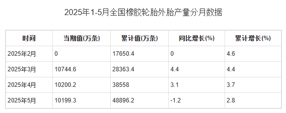2025年5月全國橡膠輪胎外胎產(chǎn)量10199.3萬條,同比下降1.2%,2025年1-5月全國橡膠輪胎外胎產(chǎn)量為48896.2萬條,累計增長2.8%。