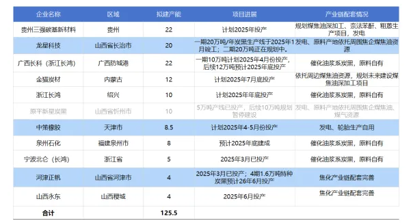 從2025年待投產(chǎn)項(xiàng)目統(tǒng)計(jì)來看,2025年待投產(chǎn)產(chǎn)能多大115萬噸,除一家輪胎企業(yè)配套8.5萬噸炭黑產(chǎn)能配套自用外,其余均為目前已進(jìn)入行業(yè)的炭黑企業(yè),為了能夠及時(shí)響應(yīng)下游需要,均衡運(yùn)輸成本,多地布局。在行業(yè)價(jià)格戰(zhàn)內(nèi)卷的當(dāng)下,多數(shù)企業(yè)都走上產(chǎn)業(yè)鏈配套發(fā)展之路,炭黑廠靠近焦化廠建設(shè),節(jié)約原料運(yùn)輸成本的同時(shí),焦化企業(yè)的副產(chǎn)物焦?fàn)t煤氣也可以作為生產(chǎn)燃料,實(shí)現(xiàn)產(chǎn)業(yè)鏈循環(huán)經(jīng)濟(jì)。