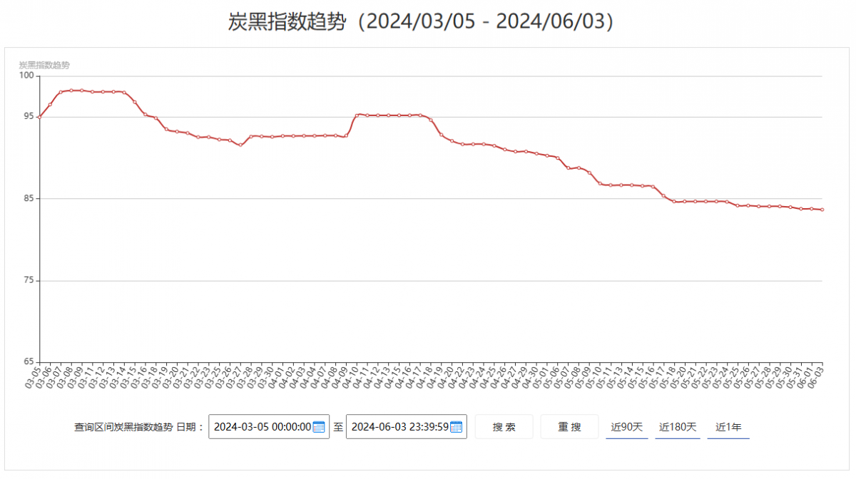 炭黑產(chǎn)業(yè)網(wǎng)根據(jù)市場(chǎng)N330/N220/N550三個(gè)牌號(hào)最新市場(chǎng)成交價(jià)格,并分別按一、二、三線品牌權(quán)重分配計(jì)算后得出今日最新炭黑指數(shù)為83.66,從走勢(shì)曲線來(lái)看,近期炭黑表現(xiàn)持續(xù)下行。