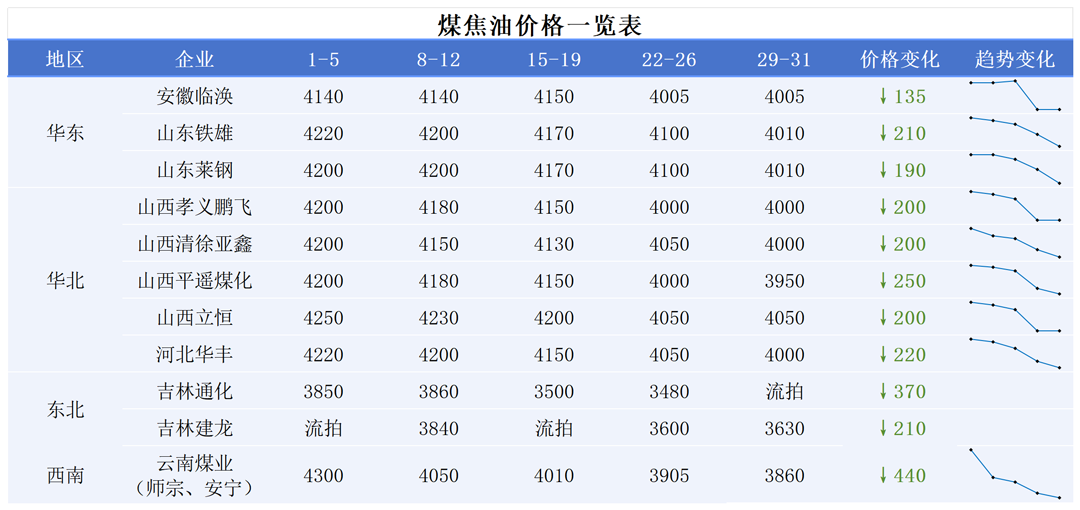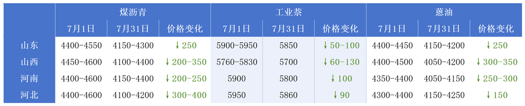 月底,受下游需求減弱的影響,煤焦油主流新單拍賣價(jià)格繼續(xù)小幅走低50-90元/噸,部分地區(qū)持平。據(jù)炭黑產(chǎn)業(yè)網(wǎng)統(tǒng)計(jì),7月山西、山東、河北地區(qū)新單拍賣成交價(jià)格跌幅較大,累計(jì)跌幅在190-250元/噸;而相比之下,安徽地區(qū)的跌幅要少點(diǎn),為135元/噸。