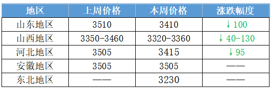 從本周市場(chǎng)新單拍賣成交情況來看,除安徽地區(qū)外,其他主流地區(qū)新單拍賣繼續(xù)下降,整體下跌幅度在40-130元/噸左右,山西地區(qū)繼續(xù)領(lǐng)跌。今日河北、山東地區(qū)議價(jià)出臺(tái),河北跟隨山西走勢(shì),主流降至3415元/噸,山東地區(qū)則是拍賣成交,價(jià)格為3410元/噸,降幅100元。