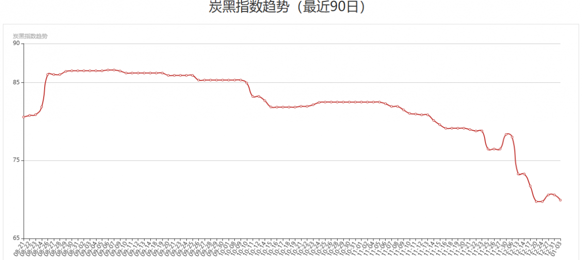 炭黑產(chǎn)業(yè)網(wǎng)根據(jù)市場N330/N220/N550三個牌號最新市場成交價格,并分別按一、二、三線品牌權(quán)重分配計算后得出今日最新炭黑指數(shù)為69.92,與之前相比炭黑指數(shù)依然維持在下行區(qū)間。