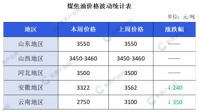 今日高溫煤焦油拍賣價格持續(xù)走低,安徽地區(qū)拍賣再度下滑105元/噸,外圍市場高溫煤焦油價格已跌破3000元,最新成交價格為2750元/噸。經(jīng)過兩輪拍賣后,安徽地區(qū)高溫煤焦油價格較上周累計下跌240元。炭黑市場維持觀望運整,市場悲觀心態(tài)難改。