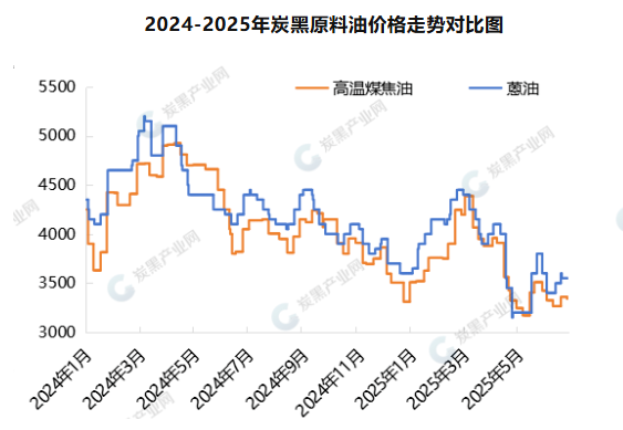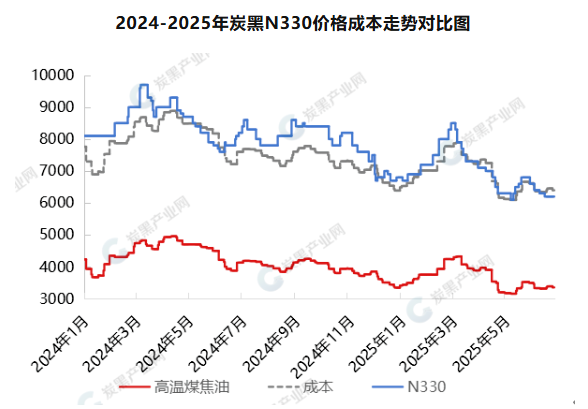 從歷史數(shù)據(jù)窺探行業(yè)發(fā)展邏輯,受行業(yè)基本運行邏輯和需求市場淡旺季影響,炭黑價格波動變化趨勢和時間節(jié)點與往年價格走勢相似,但是2025年價格重心遠低于去年同期,價格高低價差較去年收窄,上半年均價在7006.86元/噸,同比跌幅在17.68%。價格重心下行,一是由于隨著2025年新增產(chǎn)能投產(chǎn)落地,但需求增量不及供應擴增,市場供大于求矛盾加劇,影響市場價格進入低位、盈虧線徘徊期;二是原料高溫煤焦油價格走低影響,炭黑與煤焦油走勢高度掛鉤,高溫煤焦油價格公開透明,對于市場上下游從業(yè)者評判分析影響較大。