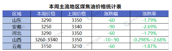 新一周煤焦油走勢已定,臨渙煤焦油價格為3250元/噸,山東、河北地區(qū)價格為3290元/噸,山西地區(qū)價格3260-3340元/噸,較上周跌幅在60-90元/噸。煤焦油價格小幅下行波動,市場需求淡季影響明顯,未來煤焦油和炭黑行業(yè)預計延續(xù)窄幅頻繁波動趨勢。